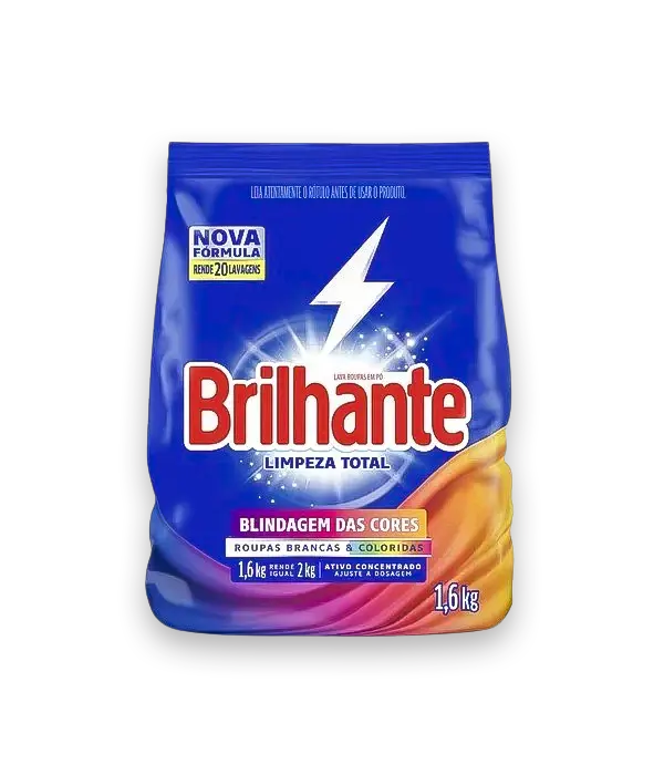 O Sabão em Pó Brilhante 1,6Kg foi desenvolvido para quem busca uma limpeza eficaz e, ao mesmo tempo, deseja manter suas roupas sempre impecáveis. Com uma nova fórmula, ele combina o poder das enzimas, que removem as sujeiras mais difíceis, com a tecnologia Brilho Ativo, que protege as cores e evita o amarelamento das roupas brancas.